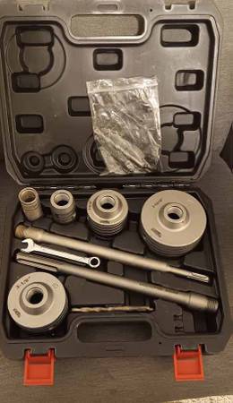 11 Piece tungsten concrete hole saw kit for Concrete, brick, stone, cement drilling. $35 Includes 5 bits: 300mm, 40mm, 65mm, 80mm, 100mm (1 3/16", 1 9/16", 2 9/16", 3 1/8", 3 15/16"). Max shank and SDS connecting rods (11.8" long). 3 pilot bits, screw wrench and carry case. Used only smallest bit one time for brick (this set was cheaper than the one bit I needed, a cheap looking masonry bit from a big box store) . Worked well in brick - I used it wet but instructions say wet or dry.