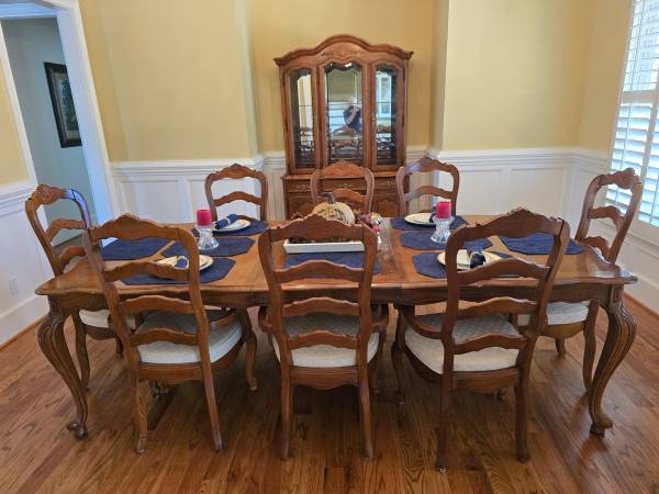 Oak dinning table with 2 extensions and 10 chairs (8 are arm chairs as shown with one extension), and lighted hutch. Retail cost was almost $10,000. Asking only 1700 OBO.