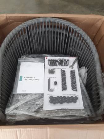New, in box, set of 4 indoor/outdoor bar stools. Bar height, 360 degree swivel with waterproof cushions. Perfect for backyard, porch, patio, poolside, garden, dock, and bar.