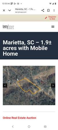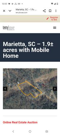 Mobile home and 2 acres for sale Marietta Greenville SC 29661 off pumpkin town hwy beside b and m sanitation can have a business there unzoned land terry Howe auctioning it off November 7 thru 20