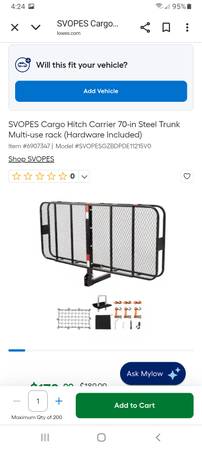 Svopes cargo carrier, New, never used, in original shipping box. It has 500 lb capacity. Includes net, rachet straps, stabilizer, accessories. Msrp is $190. Price is $125.
