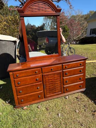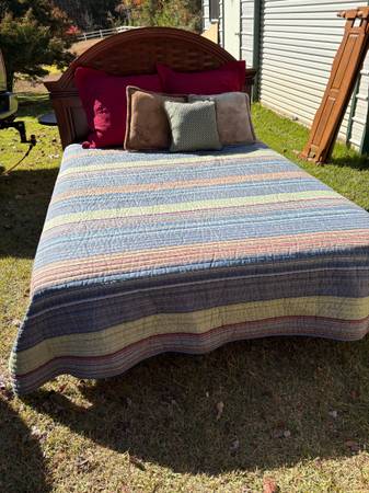 Queen size bedroom set; queen size bed with headboard, metal frame; mattress and box springs; comforter and throw pillows; dresser with mirror and two nightstands(only one pictured) In excellent...