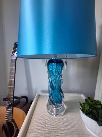 Georgeous table lamp for those of us who adore turquoise. This sports a twisted design completely in glass with turquoise in the center and clear glass outside, all one hand-blown piece! Matching deep turquoise silk shade. Handles 2 light bulbs, has a silver pull chain. 23" tall and 14" wide at top. Don't let this one get away, only one.
