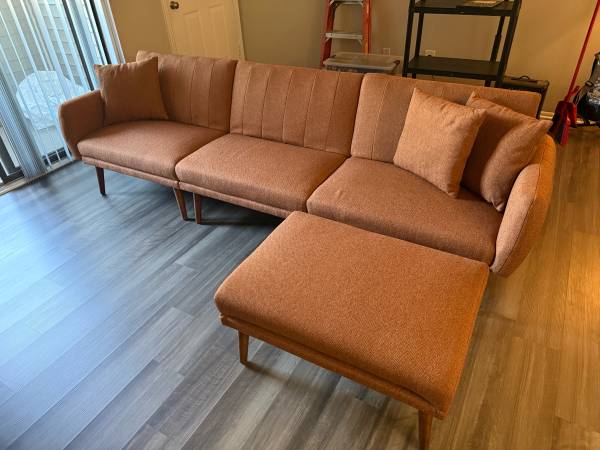 Orange mid-mod style couch with ottoman. Bought 3 months ago, but I am moving and will not be able to take with me.