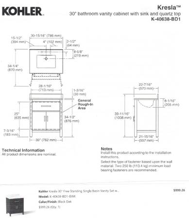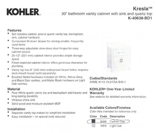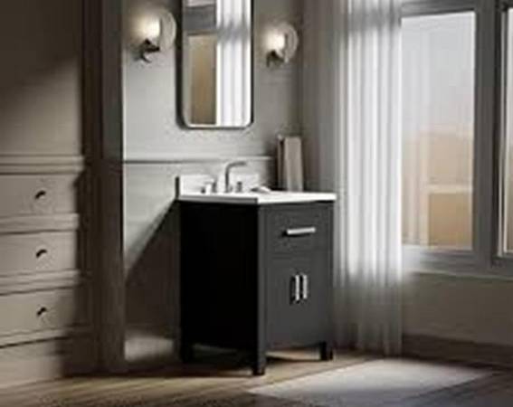 We bought this vanity cabinet and sink top for a bath remodel but ended up using a different vanity instead. This one was never installed and we could not return it because we threw the shipping box and pallet away! It's still in the packing wrap, so our loss is your gain. It cost us $999 new and we paid even more than that with shipping and tax. Anyway, if you can use it here it is. We are asking $599 or we will take the best offer we can get. The pics show all the technical specs, measurements, etc. Includes the vanity cabinet, sink, quartz sink top and backsplash. Does not include plumbing fixture.