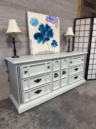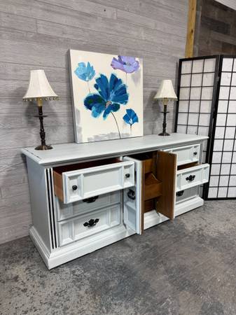 Vintage triple dresser— by Broyhill ; painted/distressed farmhouse white with gray & black layers; all drawers are solid wood, & slide easily, working just as they should; more drawers behind the center cabinet door