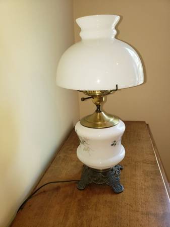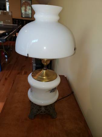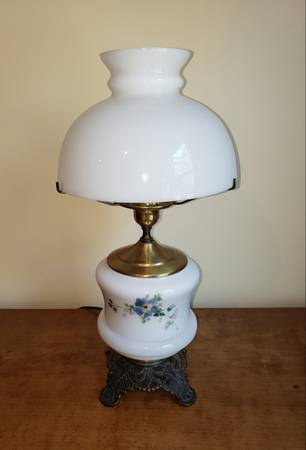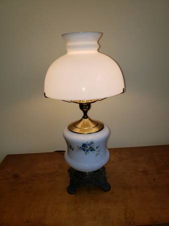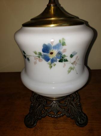 Vintage Hurricane Lamp - white Milk Glass with Painted Blue Flowers...