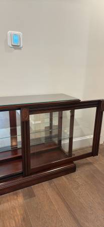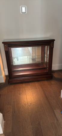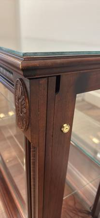 Beautiful wood carved design. Front door slides from left to right for easy access. Door can be locked with key. Lighted, Power chord runs thru so cabinet can light up. One adjustable glass shelf....