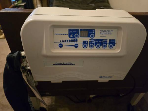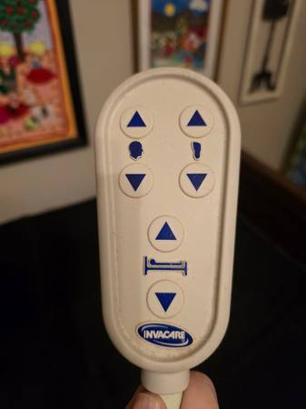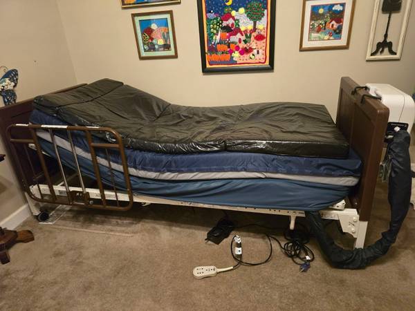 Top of the line Invacare Hospital bed. Adjustable feet and head & overall bed height. Metal rails on both sides. Has air flow mattress to reduce bed sores, also has extra thin black mattress if power goes out. Excellent condition!