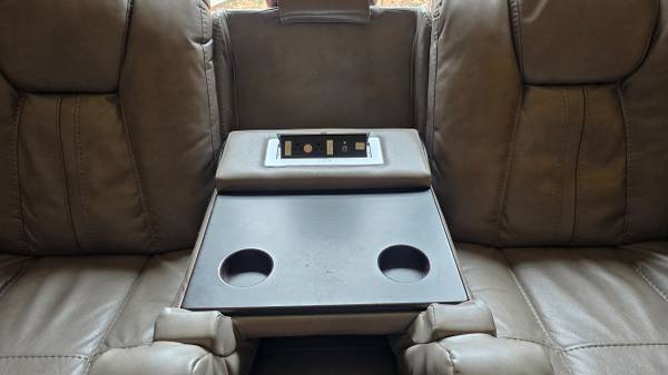 Reclining leather sofa under a year old. Has cup holders and storage in both arm rests. Middle folds down and has electrical outlet. Minor surface scratches. Gray brown color. Will not text codes or...