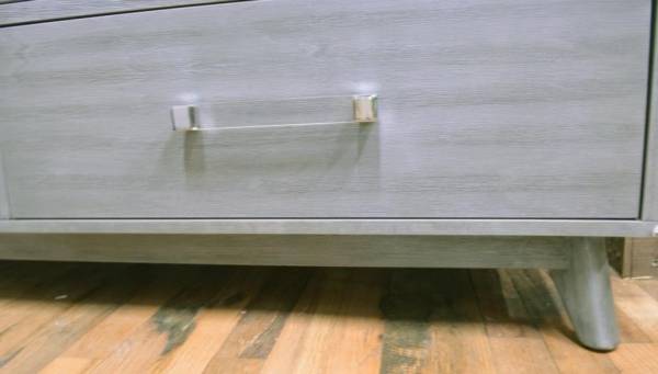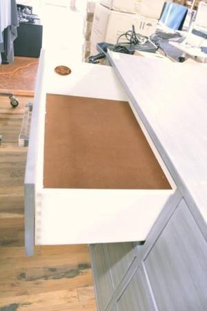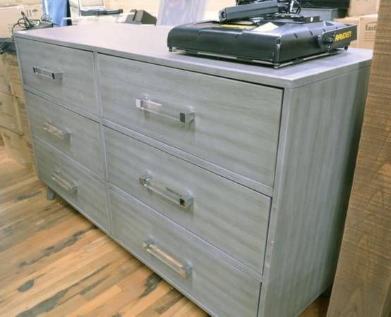 Paid 699$ like new! My loss your gain. Cloud grey color. Drawers are soft close with silver color and lucite handles, dovetail joints, marked Oxford Baby. 56x20x34. Located at DG consignment, main...