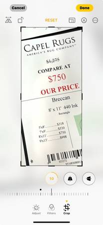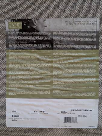8' X 11' Capel Rug. We bought it for $750 two years ago, but haven't used it. Our mistake is your gain! Thanks for looking!