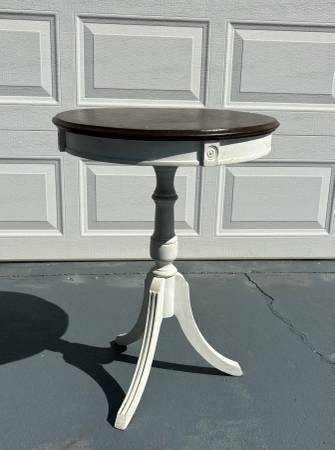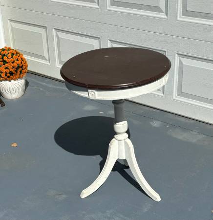 Round solid antique wood table (believe to be Walnut). Was partially painted and can be painted the color of your choice.
