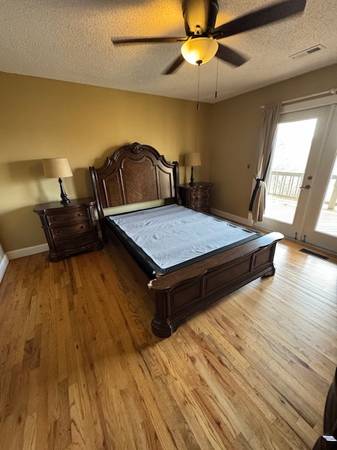 LIKE NEW One year old High End King Bedroom Set with one year old mattress included. Bed, Two Night Stands, Dresser and Mirror. MUST GO THIS WEEK. $1100 OBO. Bed: 7’ 3” long by 6’ 9” wide Headboard...