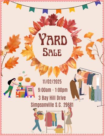 Yard Sale 11/02 9:00 am- 1:00 pm Great items Great prices Pictures are just a preview! Items include: Clothes Party supplies Home decor Craft supplies Holsters Bags Games Books And More…