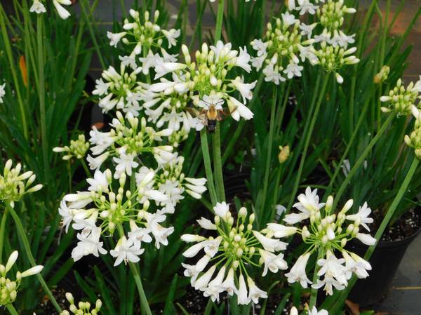 Galaxy White Agapanthus produces 5" clusters of white flowers in the Summer. The flower heads are held about 36-42" high. Likes a sunny location and is more cold hardy than other Agapanthus. These plants are in 6" pots and are about 12-15" tall (see the last photo). Please call before you come. Thanks.