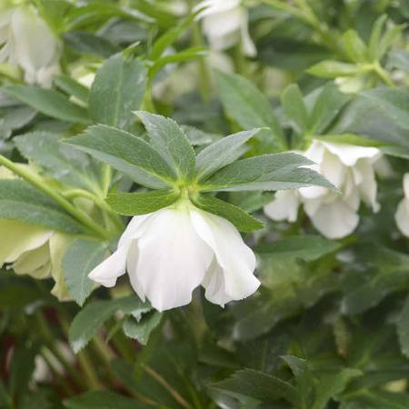 Wedding Bells has 2-2 1/2" double, pure white flowers. They appear in late Winter and early Spring. Grows to be 18-24" tall. Requires a shady location and can take some drought once they are established. These plants are in 3 quart pots, they are mature and flowering size (see the last photo). Please call before you come. Thanks.