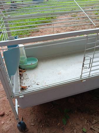 indoor guinea pig or rabbit cage top opens has wheels to roll around and sliding door on the side also comes with feeder and waterer
