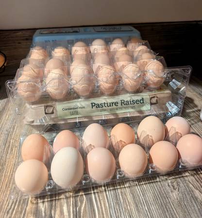 Fresh brown eggs, free range on 1.5 acres, $3/dozen. Text is best.