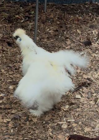 Young silkie rooster. Just started crowing a few weeks ago. Will trade for hen or make a deal.