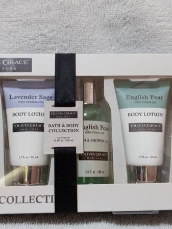 Here's a nice Olivia Grace NY bath set. It contains 3 x 3.4 oz bath shower gel (Turkish Rose, Lavender Sage, English Pear) and 3 x 1.7 oz body lotion. The lowest I've seen these is $10 on ebay.