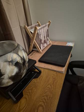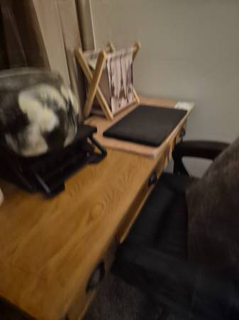 Very nice, solid wood desk, simple small. It could fit into any space. It could be for professional use, working out of your home, or you can have it for a student and it comes with a very nice leather swiveled chair. If you sincerely interested, please feel free to give me a call or simply text no shipping and no layaway. Thank you.