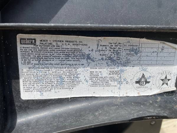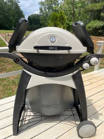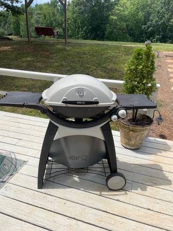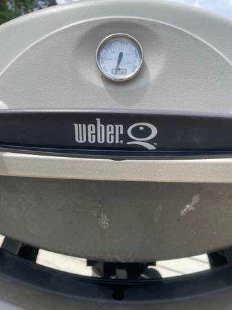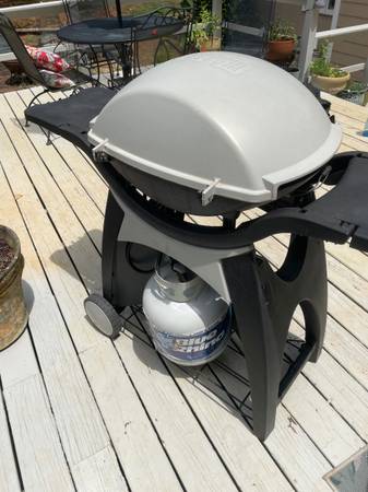 WEBER GRILL Q SERIES, MODEL Q300, WITH FULL STAND, 20LB PROPANE TANK, PLUS COVER. HAS DOUBLE STAINLESS STEEL BUDRNERS IN EXCELENT CONDITION, EVERYTHING WORKS AS IT SHOULD, PUSH BUTTON STARTER, WORKING HEAT TEMP GAUGE. NEW ONES ARE SELLING FOR $599 WITHOUT PROPANE TANK OR COVER. WE HAVE HAD THIS ONE FOR SEVERAL YEARS AND LIKED THE EVEN COOKING DESIGN, AND ABILITY TO DISCONNECT FROM STAND AND SET IN A PICNIC TABLE WHEN CAMPING. ASKING $98! CALL OR TEXT, IF YOU SEE IT ON THIS SITE, ITS STILL AVAILABLE!!
