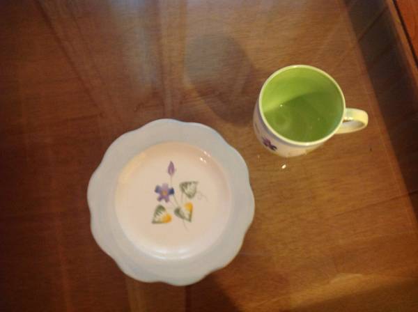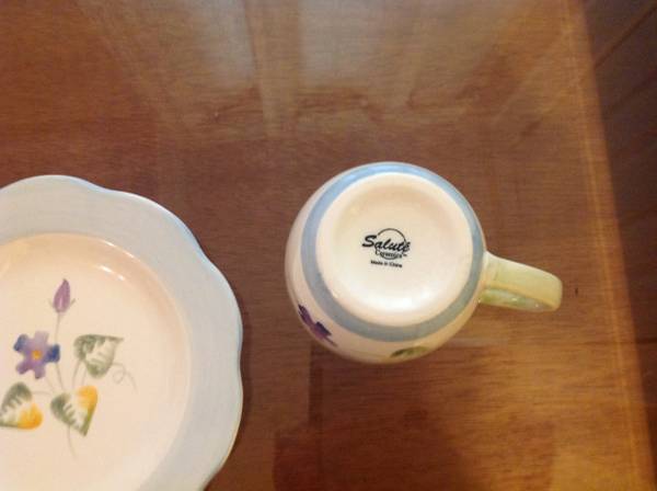 I have a Salute Ceramics made in England Salad Plate and Mug SLU21 Pattern Number 3286 Purple Flowers No Trim Scalloped Design for sale for sale for $5.00. The salad plate measures 8 5/8" and the...