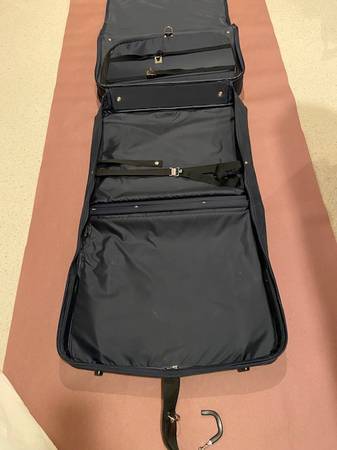 Good condition. Heavy duty and durable with strong handle and carry strap. Reinforced piping around all outer edges. Separate compartment for shoes, accessories, etc. NOT ON WHEELS.