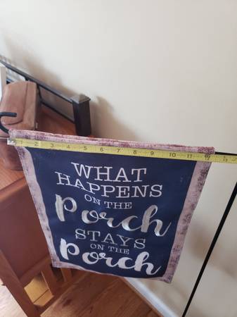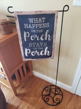 Porch Decor- Flag & Stand Indoor/Outdoor Blue Flag with Cream Lettering & Border Black Metal Pole/Stand with Base (detachable - use with base to stand on flat surface or can stake into...