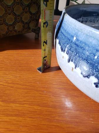 Pottery Serving Bowl Colors: Blue & Gray-ish Hues Approx measurements: 9" diameter x 3 1/2" H Approx weight: 3 1/2" Good Condition. One small chip on edge. See pictures for details. Cash only,...