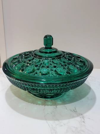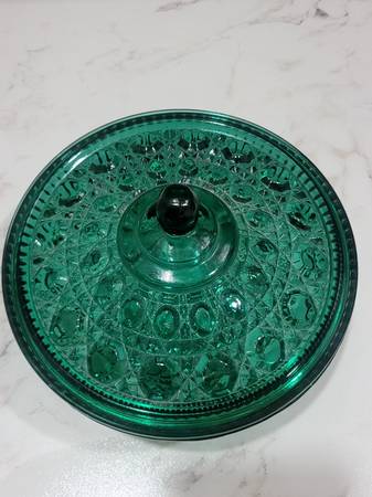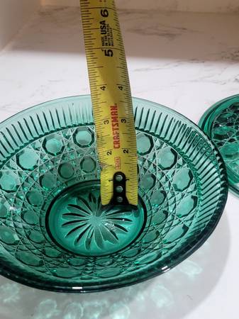 The Vintage Indiana Glass Windsor Button & Cane Emerald Green Candy Dish with Lid is a stunning piece of Art Deco style decor. Made in the United States in 1965, this round candy dish features a vibrant red color with an all-over pattern. The dish is made of ruby glass and measures 7.5 inches in diameter, with a height of 5.5 inches including the lid. It is a decorative item that adds a touch of vintage charm to any space, perfect for collectors of retro glassware.