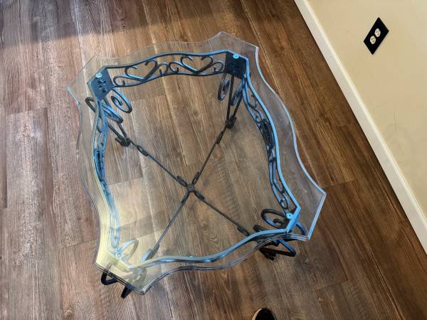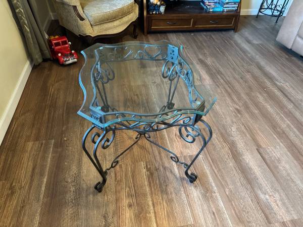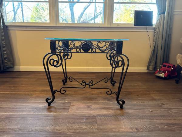 Enhance your space with this elegant wrought iron and glass accent table, perfect for a living room, hallway, reading nook, or entryway. The table features a beautifully shaped beveled glass top and a sturdy, ornate iron base with scrollwork details. Its timeless, classic design works well with traditional, vintage, farmhouse, or eclectic décor.