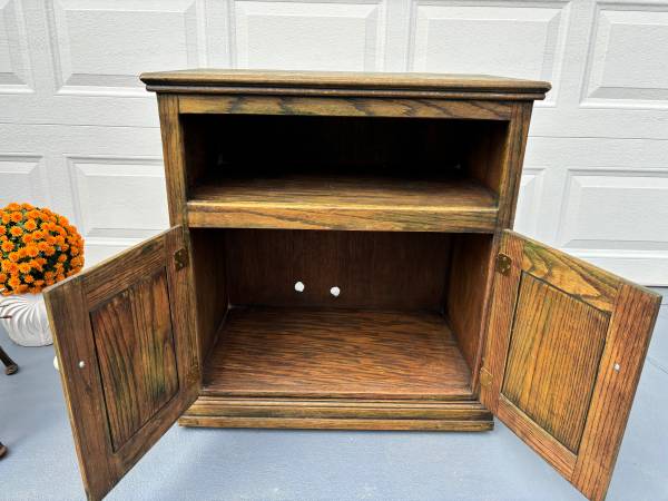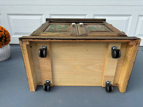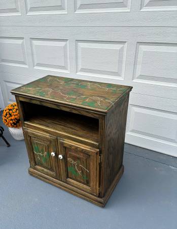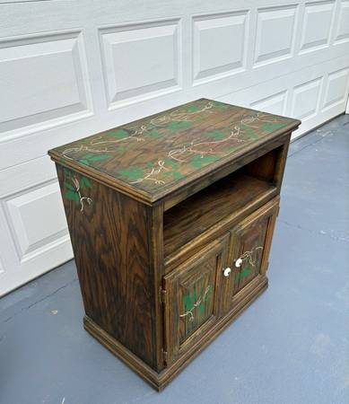 Wood cabinet on wheels and is hand painted. Can be used for a microwave, gardening cart, or a variety of uses. Solid real wood and well built.