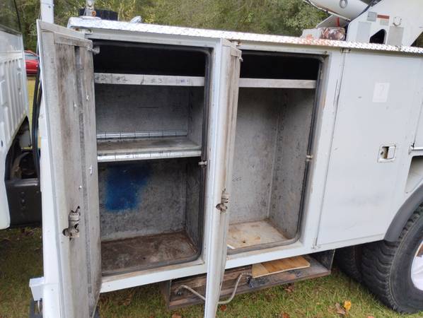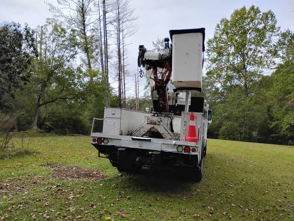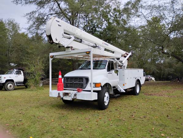 Material Handler, aka Bucket truck For Sale 20,000 2000 F750 3126 CAT engine 114k miles 7 Speed transmission 55ft reach 2000lb jib crane with hydraulic winch 2 man bucket NEW Virgin tires AC/ Heat...