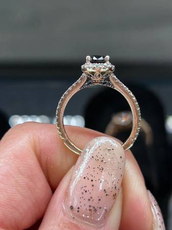 pear shaped black moissanite engagement ring or "me ring" Neil Lane, 14k rose gold, small chip in center diamond, 1-1/8 ct