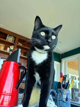 Black male cat with white chest, paws and tail tip. Grey flea collar. Very sweet friendly cat. We just adopted him 3 days ago but he slipped out the door and im afraid he’s trying to find his former...