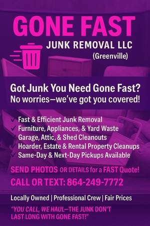 🚛💨 GONE FAST JUNK REMOVAL LLC (Greenville, SC) 🗑️ Got Junk You Need Gone Fast? No worries — we’ve got you covered! ✔️ Fast & Efficient Junk Removal ✔️ Furniture, Appliances, & Yard Waste ✔️...