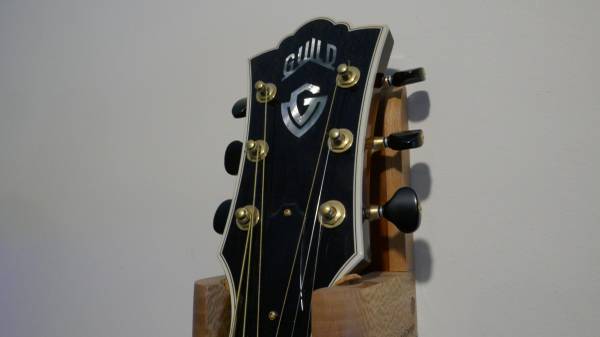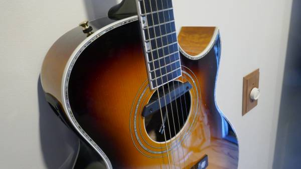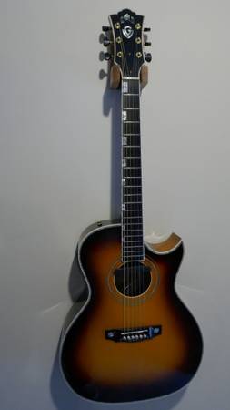 Guild DD6-MC Doyle Dykes 2014 signature guitar. Orchestra body style with a Florentine cutaway, giving players easy access to higher frets. The sunburst finish highlights the guitar's stunning Solid AAA Red Spruce top and Solid AAA Quilted Big Leaf Maple back and sides, which are reinforced with Red Spruce scalloped bracing. The gloss nitrocellulose lacquer finish and white body binding with abalone trim provide a luxurious touch. The guitar also boasts a three-piece Mahogany neck with a Rosewood center, an Ebony fretboard with a 12" radius and custom D-55 style position inlays, and gold hardware, including Gotoh 510 tuners with black buttons. The guitar's Ebony bridge, bone nut, saddle, and bridge pins ensure optimal tone and resonance. It has a nut width of 1 3/4", extra tuner spacing, a scale length of 25 1/4", and 20 frets. The guitar comes with a Guild premium hard shell case, Fishman rare earth blend