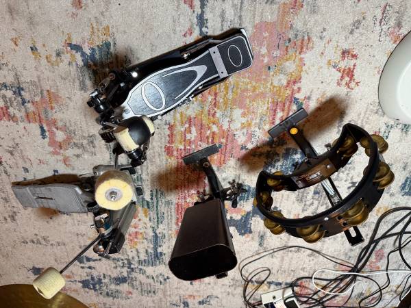I have two foot pedal stands/brackets that hold cowbells, blocks, tambourines, and other percussion instruments. Also have for sale a vintage Premier Model 252 bass drum pedal, Paiste model 200 20” ride cymbal, and cymbal stands.