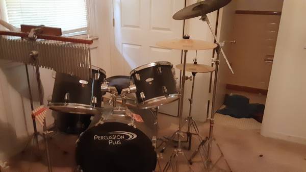 1- Five-piece Percussion Plus drum set, includes( Pro Throne, Sabian ride, crash, high-hat, Zildjian crash, Two Tier chim set)