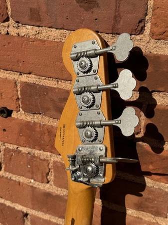 Fender Road Worn 50's MIM Precision Bass, Factory Relic finish in Fiesta Red. Alder body, Maple neck. This neck is a true 1950's HOSS. Strung with flatwound strings, low E tuner replaced with a Hipshot set up for drop D. Pickup is a Duncan Antiquity P Bass and this thing just sounds huge. Gigged up and down the East Coast with this beauty but retirement calls....No case or gig bag included, no need since this thing has its share of factory and earned scars. Cool rock stickers included for no extra charge.
