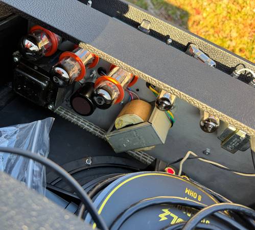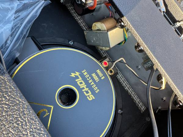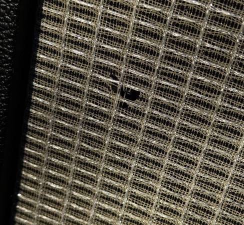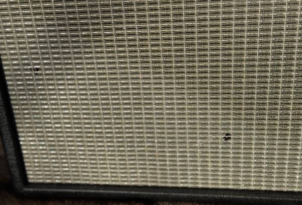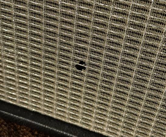 You will notice 2 damaged spots on the grill. When I was changing the speakers, the Scholz would not fit until I removed about a 1/4" of wood from the side of the flange that holds the baffle board. That all went smoothly, however, as I was finishing, the sanding wheel on my Dremel tool cracked into two pieces. They fell onto the inside of the grill. ( I didn't prepare for the worst and guard the inside of the grill from 2 red hot grinding wheel pieces!) All of a sudden I noticed the grill was melting under a piece. Got it out.....then I grabbed the other piece! I was pissed. Luckily it was a burn/melt, so there is no fraying. This was all before the speaker went in so the speaker is not damaged whatsoever. The amp is in perfect condition except for those two spots.