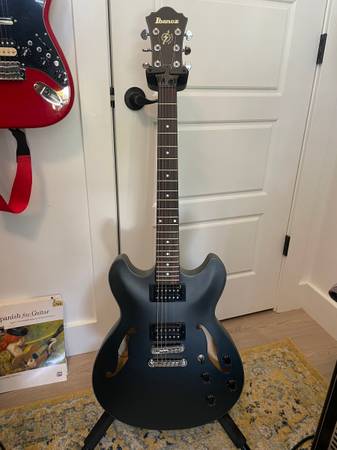 Near mint condition Ibanez Artcore AS73B-BKF-12-02. With case. One picture shows a small white dot as the only imperfection.
