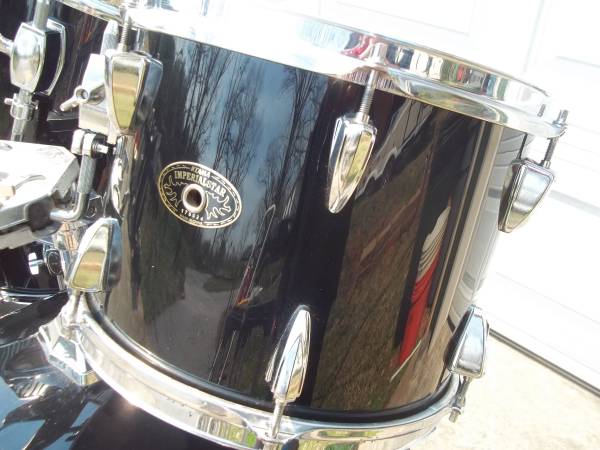 Tama Imperial Star drum kit in black finish...5 piece. 22,12,13,16 with matching 5 1/ x 14 snare. Includes Tama Logo Bass head. Good Evans onyx heads. This kit has lots of playwear but good for a practice space. Chrome is good. Feel free to ask questions. No trades, cash only.