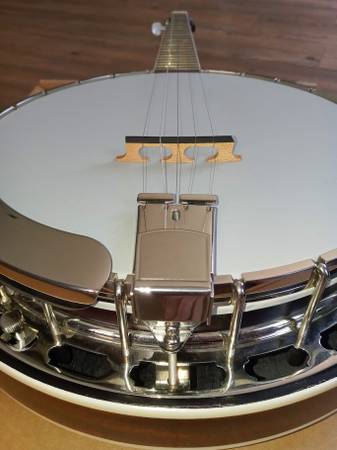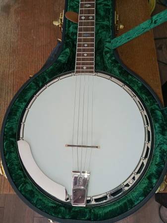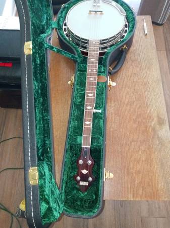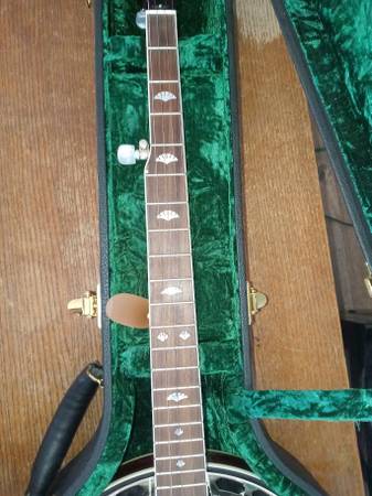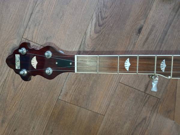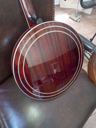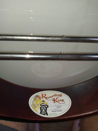 2011 Recording King RK-R50 with pre-war features including a mahogany resonator, 3-ply maple rim, nickel plated hardware, “fan” fingerboard and headstock inlays, one-piece mahogany neck, rosewood fingerboard, and a Mastertone-style flange. This banjo is a 'woodie'. It has a wood tone ring, similar construction to the Deering John Hartford, which as a 'grenadillo' wood tone ring, also weighs less. With the head properly tensioned, this banjo and its wooden rim/tone ring has a soothing mellow tone. Cosmetically the banjo shows almost no play wear, and is in excellent condition. Comes in a Recording King hardshell case. OBO