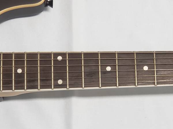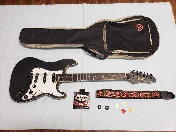 This BCP Strat Style Electric Guitar is in Excellent Condition. There are some light scratches on the body of this guitar. The frets and fretboard have been hand polished and a new set of EVH (.009" - .042") guitar strings has been installed. This guitar has been customized/upgraded. The electronics have been modified by adding a treble bleed circuit. The electronics have been further modified by adding individual tone control to the bridge pickup. When the 5-way pickup selector switch is in the 5th position (bridge position) the tone can be controlled for just the bridge pickup. The other 4 positions work as usual for Stratocaster style guitars. This tone modification is similar to the Fender Stratocaster Player Series setup. The original string trees at the headstock were replaced with nicer string trees. This guitar has be set up with a nice action for fast soloing. This is a great sounding, great playing and great looking electric guitar. Included with this BCP guitar is a use gig bag, shoulder strap, several picks and two rubber strap locks. Although this guitar is great for beginners, the guitar has custom upgrades that intermediate level players will appreciate.
