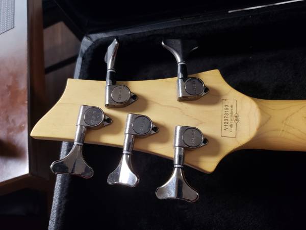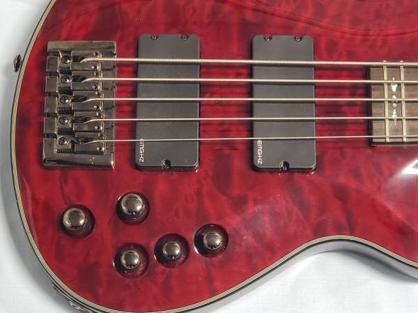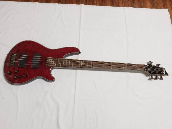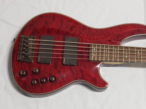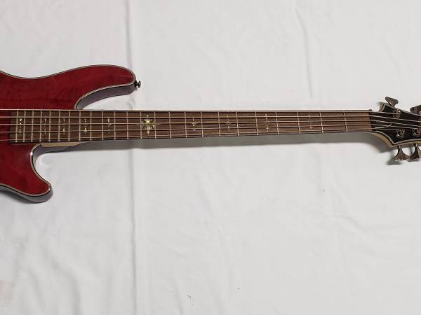 This 2012 SCHECTER DAMIEN ELITE-5 5-String Electric Bass Guitar is in Like New Condition. There are very light scratches and fading on the hardware. There frets and fretboard are in excellent condition. This bass guitar features a 35" scale length, decorative neck inlays, a string-thru body, 24 frets, a mahogany body and a maple neck. The bass comes in the Crimson Red color. This is a awesome sounding, awesome playing and awesome looking electric bass guitar. Included with this bass is a used but highly functional hard shell case, a deluxe heavily padded shoulder strap and a new instrument cable. Below is the manufacturer's specs on this bass guitar. The price has been reduced to $550.