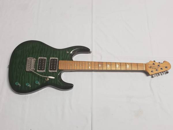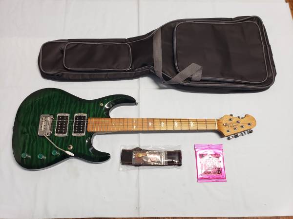 This Volgoa GTM-01 6 strings Electric Guitar with Custom Upgrades is in Near Mint Condition. The frets and fretboard have been hand polished and a new set of Ernie Ball (.009 - .042") strings has been installed. This electric guitar has been custom upgraded. A treble bleed circuit was added to the electronics. Two new decorative chrome pickup rings were installed on the body of the guitar. The original three volume-volume-tone control knobs were replaced with three new guitar chrome - emerald knobs. The original string tree was replaced with a roller style string tree. This guitar features many tonal variations including humbucker coil split. The guitar has a neck volume control, a bridge volume control and one tone control for both pickups. There is a 3-way pickup selector switch and a 2-way mini toggle switch for humbucker coil splitting. This guitar also features a mahogany body, roasted maple neck and fretboard. This guitar has been set up with a nice action for fast soloing. This is a awesome sounding, awesome playing and awesome looking electric guitar. This guitar comes with a new gig bag, new shoulder strap, a whammy bar, strap locks and several picks.