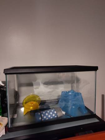 Two tanks with lids. 15 $ each. Had Hamster in them so would not use for fish. The items inside tank may be available.